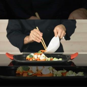 - Su amplia superficie de cocción permite cocinar distintos ingredientes a la vez sin mezclar sabores.
