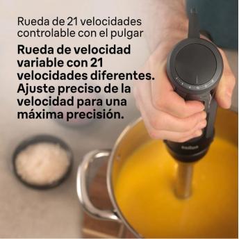 Con la batidora de mano Minipimer MultiQuick 5 MQ50202MBK tendrás el control completo en tus manos para preparar cualquier infinidad de recetas. Con sus 21 velocidades, además de la picadora y mezcladora incluidas, podrás cubrir todas las opciones en tus preparaciones culinarias.
