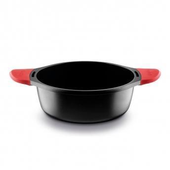 Tapadera con aro de silicona y salida de vapor oculta. Anti-adherente libre de PFOA. Cuerpo de aluminio fundido. Pomo de silicona. Asas fijas de silicona rojas. Base full induction.