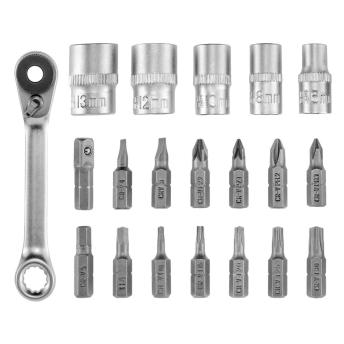 Surtido variado: Nuestro juego incluye 20 piezas cuidadosamente seleccionadas, desde puntas de atornillador de PZ, PH, Planas y Torx hasta llaves de vaso de 6, 8, 10, 12 y 13 mm. La llave de carraca incluida agiliza tus trabajos de apriete y aflojamiento.