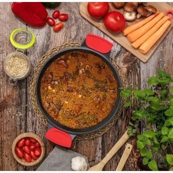 Esta paellera calienta de manera rápida y uniforme, asegurando que cada grano de arroz alcance su punto de cocción ideal. Es apta para cocinas de inducción y todo tipo de cocinas. Además, su superficie está revestida con un antiadherente de alta calidad sin PFOA que garantiza que nada se adhiera, incluso si decides usar muy poco aceite. Con su peso perfectamente equilibrado, podrás manejarla cómodamente. Con ella podrás cocinar esos arroces clásicos como la paella valenciana, la paella marinera, la paella de pollo y verduras, o un arroz negro con calamares.